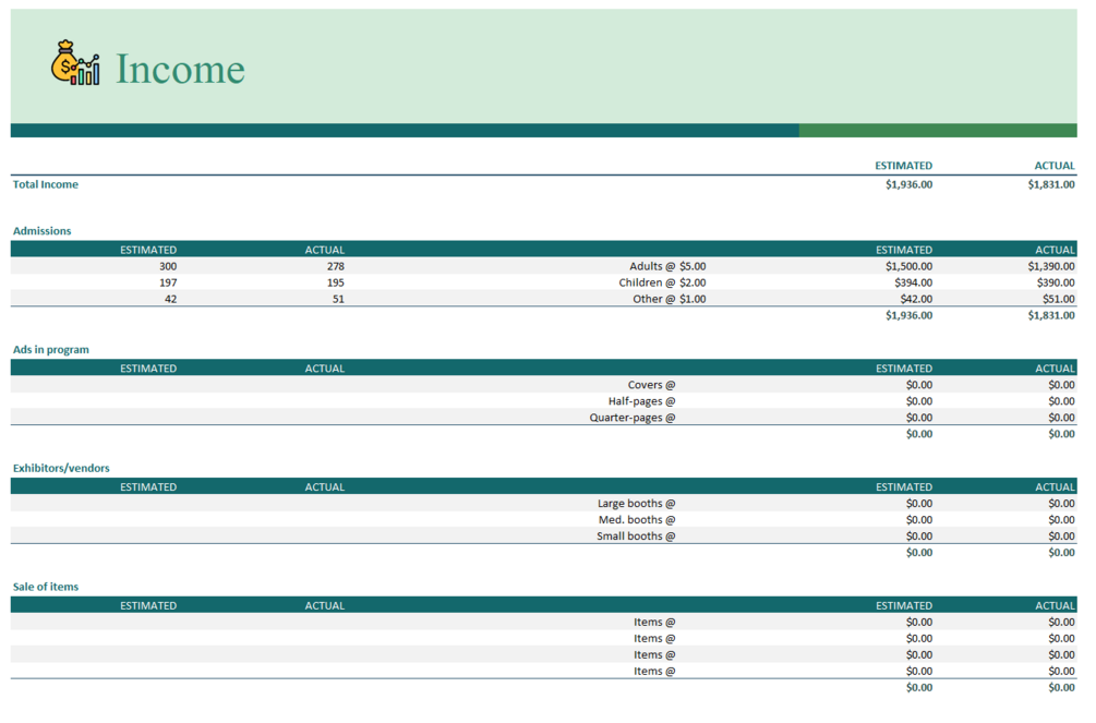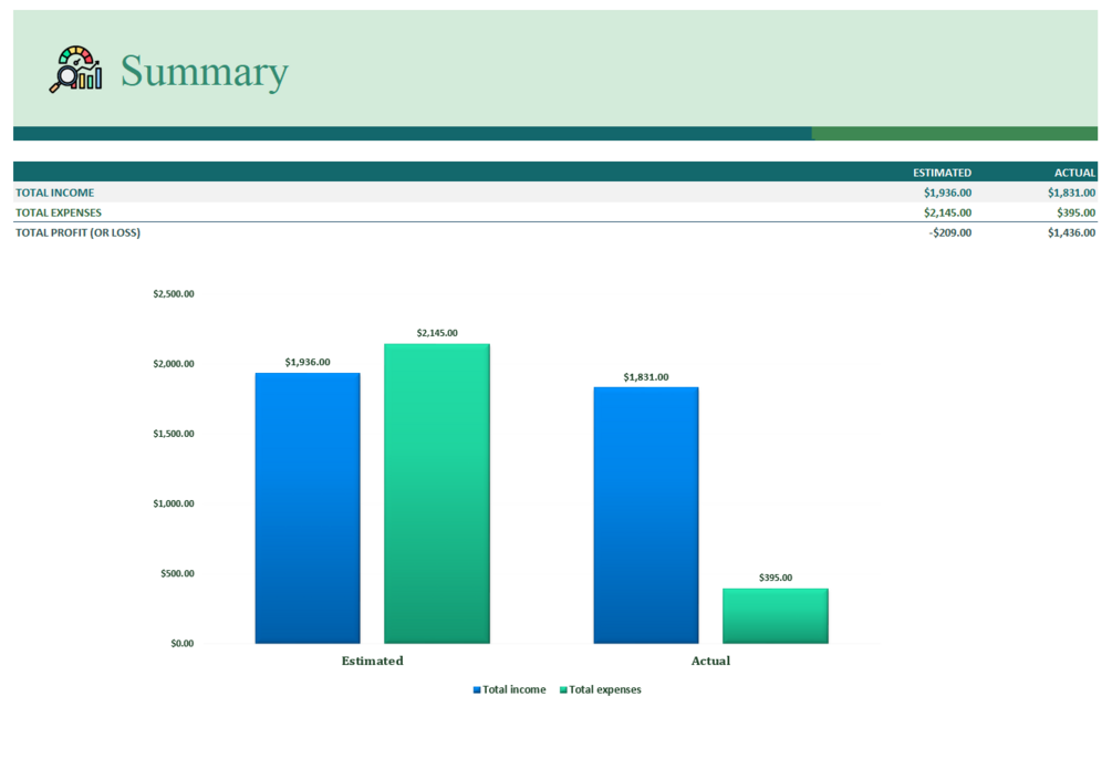 - Financial Summary Dashboard: Visualize your financials with a dynamic graph comparing income versus expenses, helping you quickly gauge your event's profitability.