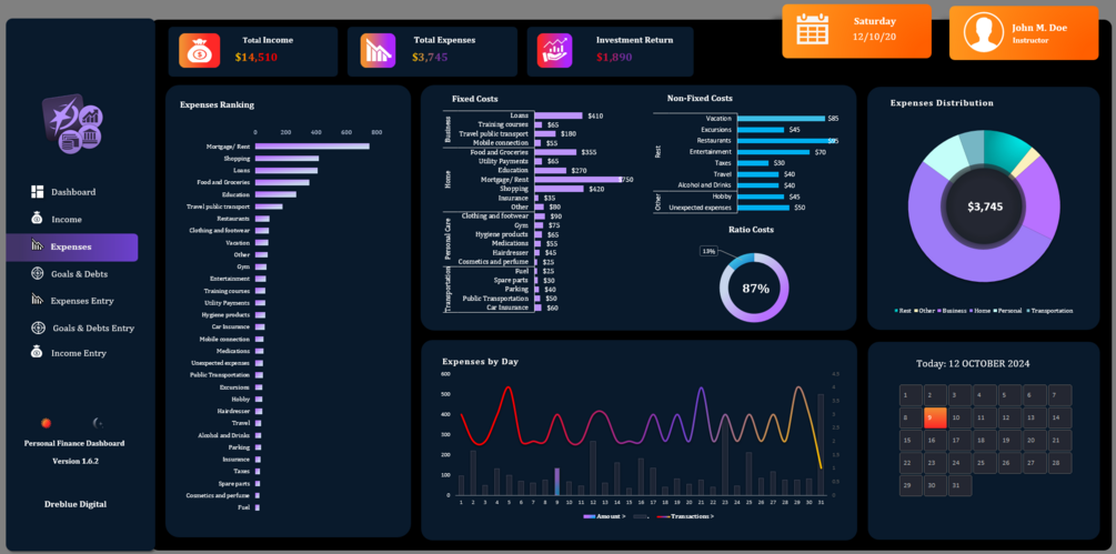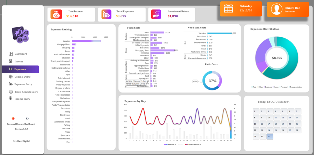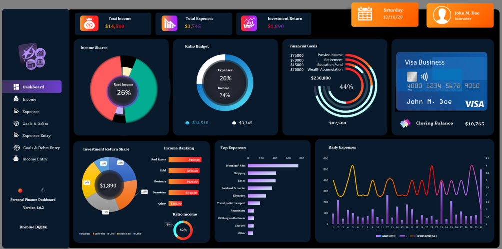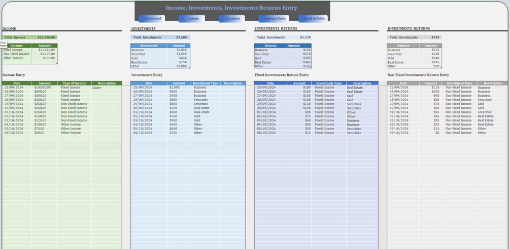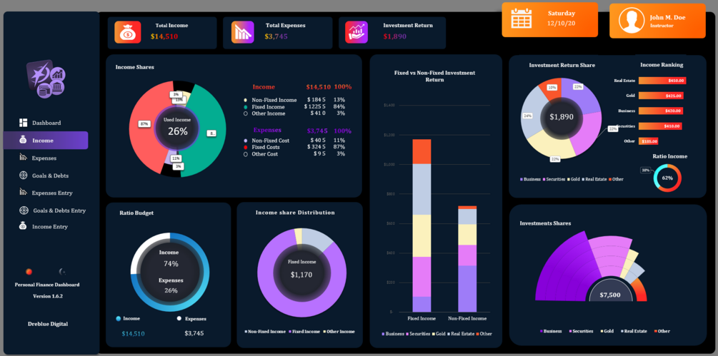 - Interactive Design: Effortlessly navigate between sections like Income, Expenses, Goals, and Investments. This Excel financial dashboard allows for a smooth, user-friendly experience.