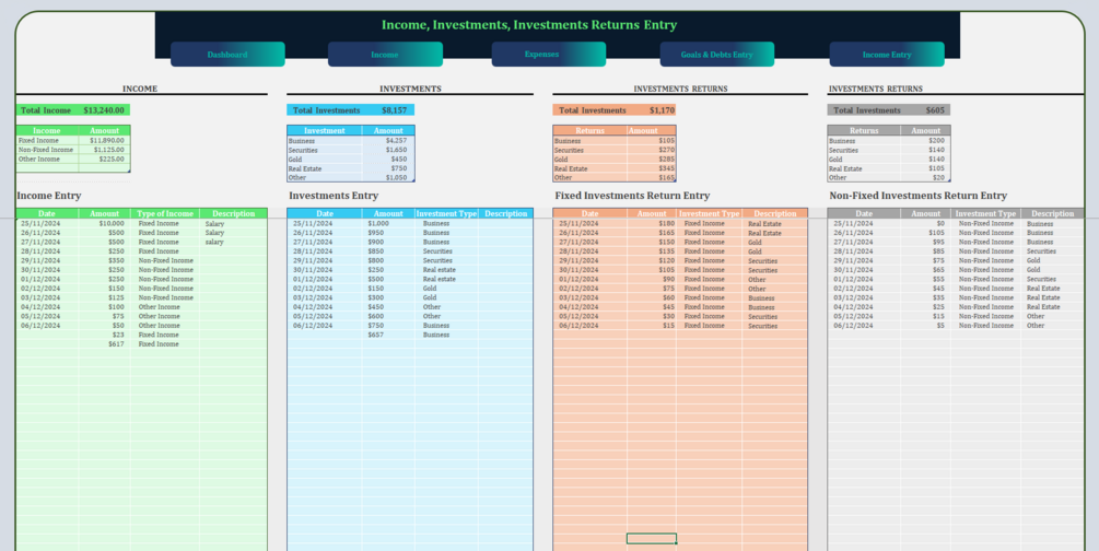 Transform your financial planning with this all-in-one dashboard! It turns complex data into clear, easy-to-read visuals, making budgeting, investment tracking, and financial management effortless. Ideal for anyone seeking a complete, interactive overview of their personal finances in one powerful platform.