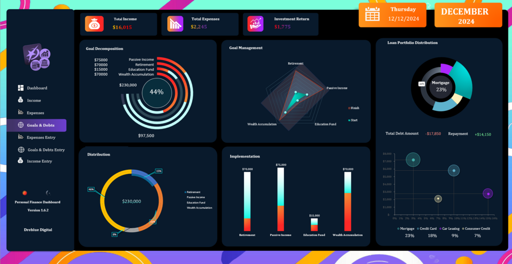 - Goal Distribution: Track your financial goals such as retirement or large purchases using a goal distribution chart, showing how much progress has been made.
