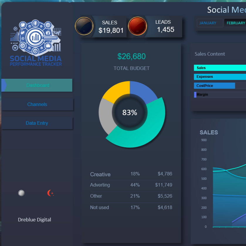 The interactive dashboard enables you to examine specific days or months in detail, giving you full control over your data analysis. Track vital KPIs like sales, ad costs, leads, CAC, CPC, CPA, and EPC within a clean, user-friendly design that includes graphic charts, a calendar view, and intuitive pie charts. For added comfort, switch between dark and light modes to suit your environment.