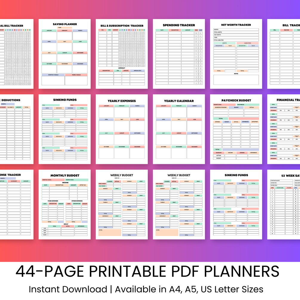 - Tracking Tools: Expense Tracker, Savings Tracker, Bills & Subscriptions, Utility Bills Tracker, Quarterly Bills Tracker.