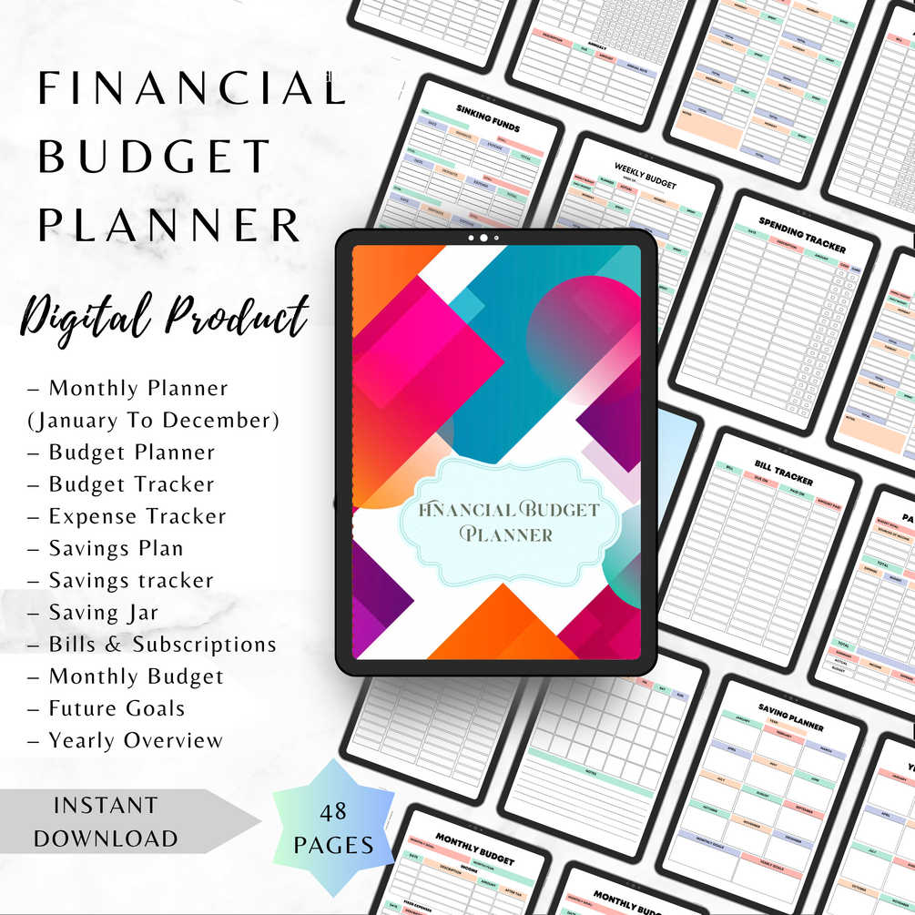 Digital financial budget planner, budget tracker, savings tracker, expense tracker, financial goals planner, debt snowball tracker, monthly budget planner, savings challenges, retirement savings tracker, personal finance organizer, financial planning tools, sinking funds tracker, yearly financial overview, 2025 calendar planner, no spend challenge, paycheck budget tracker.